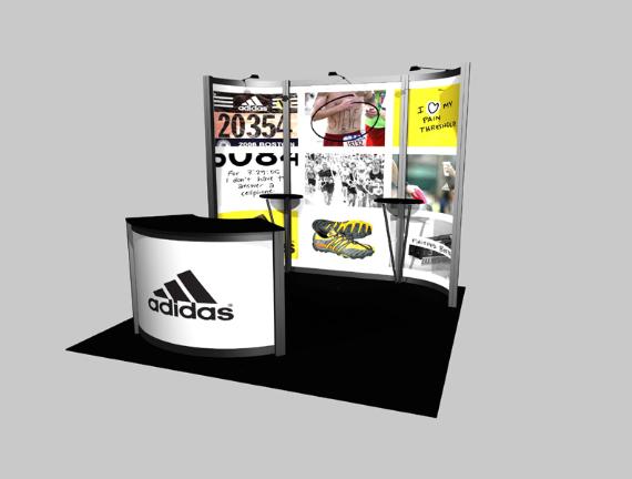 Package 1 - $3500.00 - Our rental price includes 1 10' back wall, carpet and padding, 1 reception counter, 2 peninsula counters, 3 sintra mounted back graphics, 1 1st surface vinyl graphic, 3 arm lights, round trip shipping, installation and dismantle of above rental exhibit. Price does not include, drayage, electrical or electrical labor.