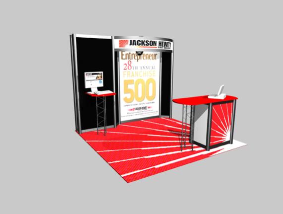 Package 5 - $3995.00 - Our rental price includes 1 10' back wall, carpet and padding, 1 reception counter, 1peninsula counter, 1 8' X 6' fabric graphic, 2 1st surface vinyl graphics, 3 arm lights, round trip shipping, installation and dismantle of above rental exhibit. Price does not include, drayage, electrical or electrical labor.