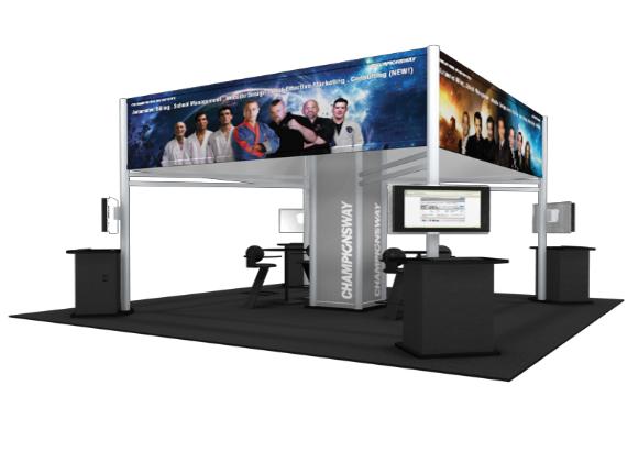 Package 3 20 X 20 - - Our rental price includes 1 20' X 20' X 14' H Structure, carpet and padding, 4 counters, 4 monitors, 2 tables & 8 chairs, 8 fabric graphics, 16 arm lights, round trip shipping, installation and dismantle of above rental exhibit. Price does not include, drayage, electrical or electrical labor.